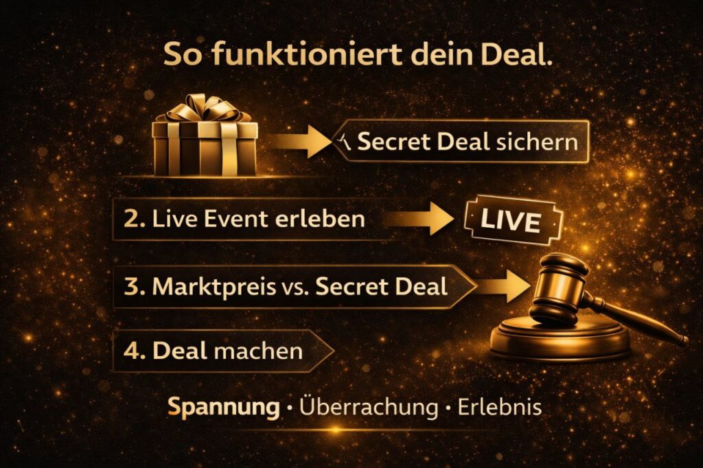 Du sicherst dir einen Deal-Wert über eBay, nimmst am Event teil und entscheidest live zwischen Marktpreis und Secret-Deal.